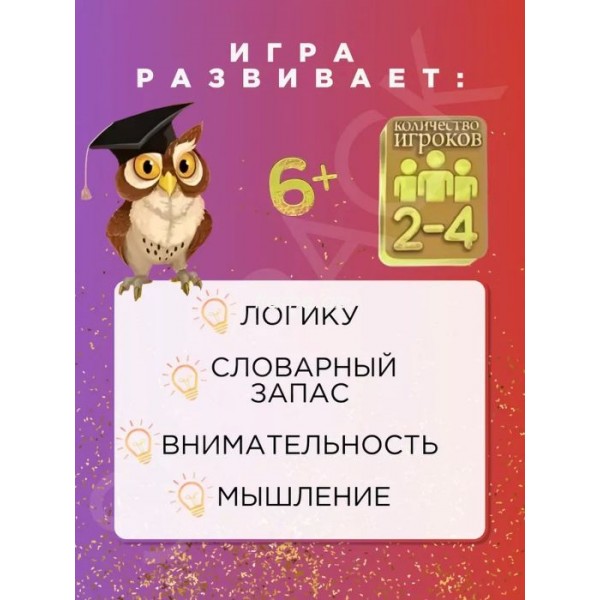Игра развивает мышление, словарный запас и умение формулировать вопросы. Подходит для 2-6 игроков от 6 лет, длительность партии 20-40 минут.