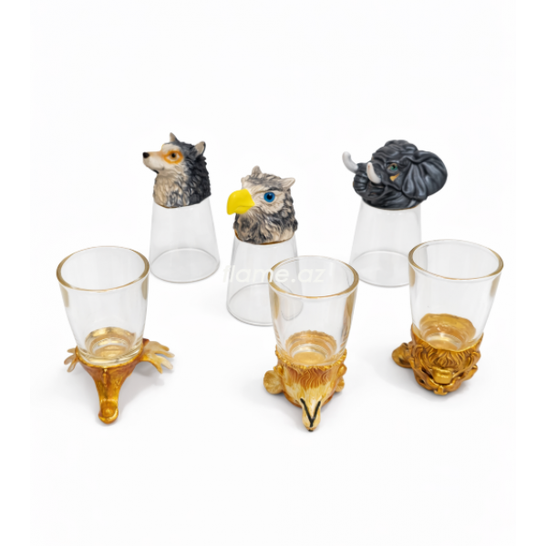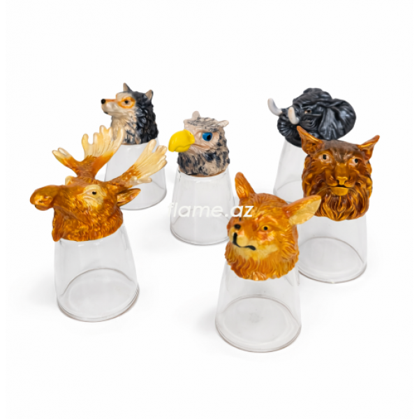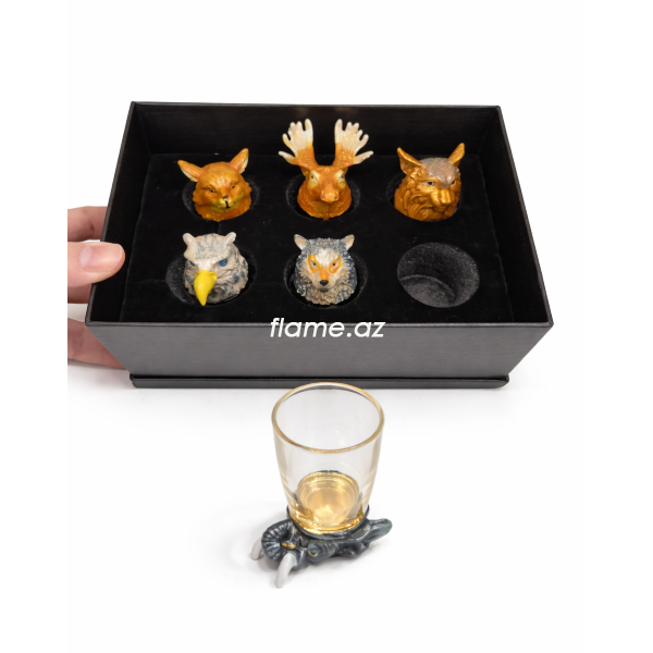 Набор рюмок с декоративными металлическими головами животных: волк, слон, олень, рысь, орел. Каждая рюмка выполнена из стекла и украшена индивидуальной фигурной насадкой. Комплект рассчитан на 6 персон и поставляется в подарочном коробке.