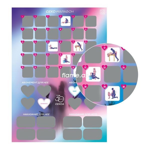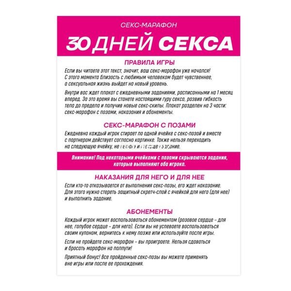 В программе вас ждёт целый месяц с позами: от простых и классических до нестандартных и сложных, а также наказания и абонементы желаний для обоих партнёров.