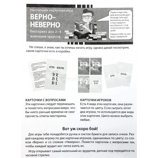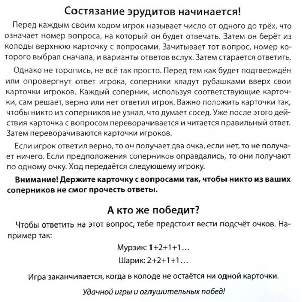 Даже если вы далеко не эрудированный человек, в этой викторине вы сможете выиграть, если будете рисковать. Игрокам предстоит решать несложные вопросы и угадать, верно ответили, или нет их соперники. Тот, кто справится с этой задачей и станет победителем. Для игры понадобятся ручка и листок бумаги для записи очков. Игра заканчивается, когда в колоде не остается ни одной карточки.